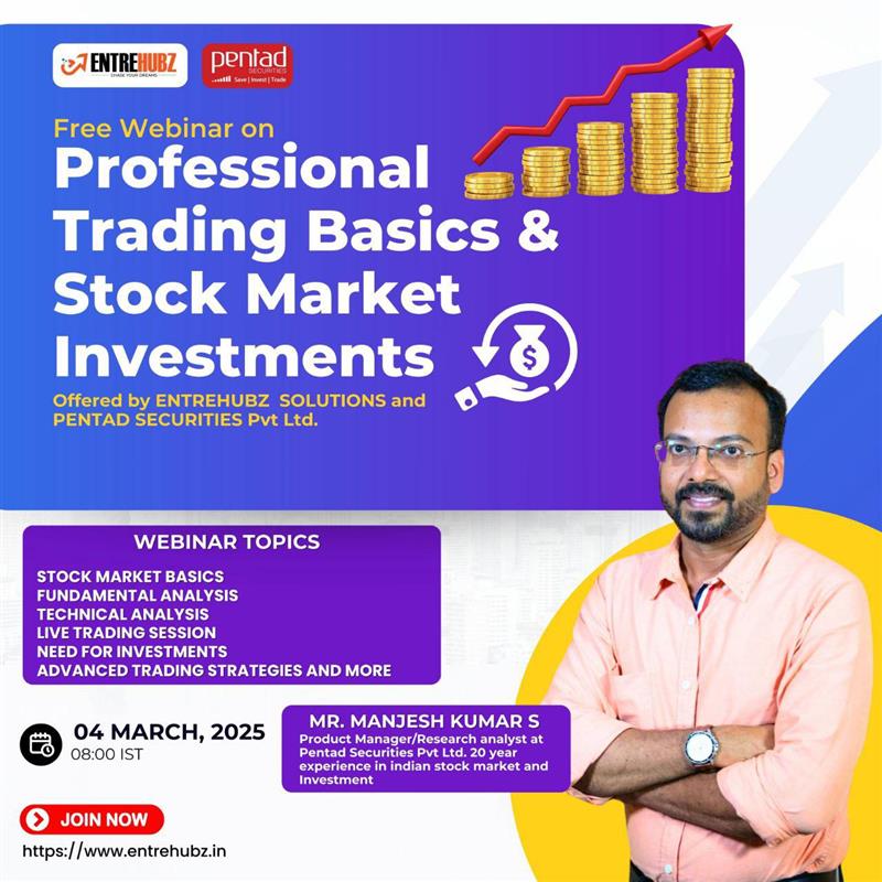ENTREHUBZ SOLUTIONS and PENTAD SECURITIES Pvt Ltd are hosting a free online webinar on Professional Trading Basics and Stock Market Investments on March 4, 2025, at 8:00 p.m. IST. The session will be led by Mr. Manjesh Kumar S, a Product Manager and Research Analyst at Pentad Securities Pvt Ltd, who has 20 years of experience in the Indian stock market and investment strategies. Topics covered will include stock market basics, fundamental and technical analysis, live trading sessions, the importance of investments, and advanced trading strategies. This webinar offers a valuable opportunity to enhance your understanding of stock market investments and trading techniques.