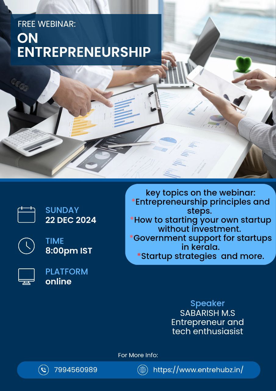 Join us for a free webinar on self-entrepreneurship, presented by ENTREHUBZ SOLUTIONS, designed to inspire and guide aspiring entrepreneurs. Scheduled for December 22, 2024, at 8:00 PM IST, this one-hour online session will cover essential topics such as the principles of entrepreneurship, steps to launch a startup without investment, government support for startups in Kerala, and effective startup strategies. Led by Mr. Sabarish MS an experienced entrepreneur and tech enthusiast, this webinar is your chance to gain practical insights and actionable advice to kickstart your entrepreneurial journey. Don’t miss this opportunity to turn your ideas into reality!